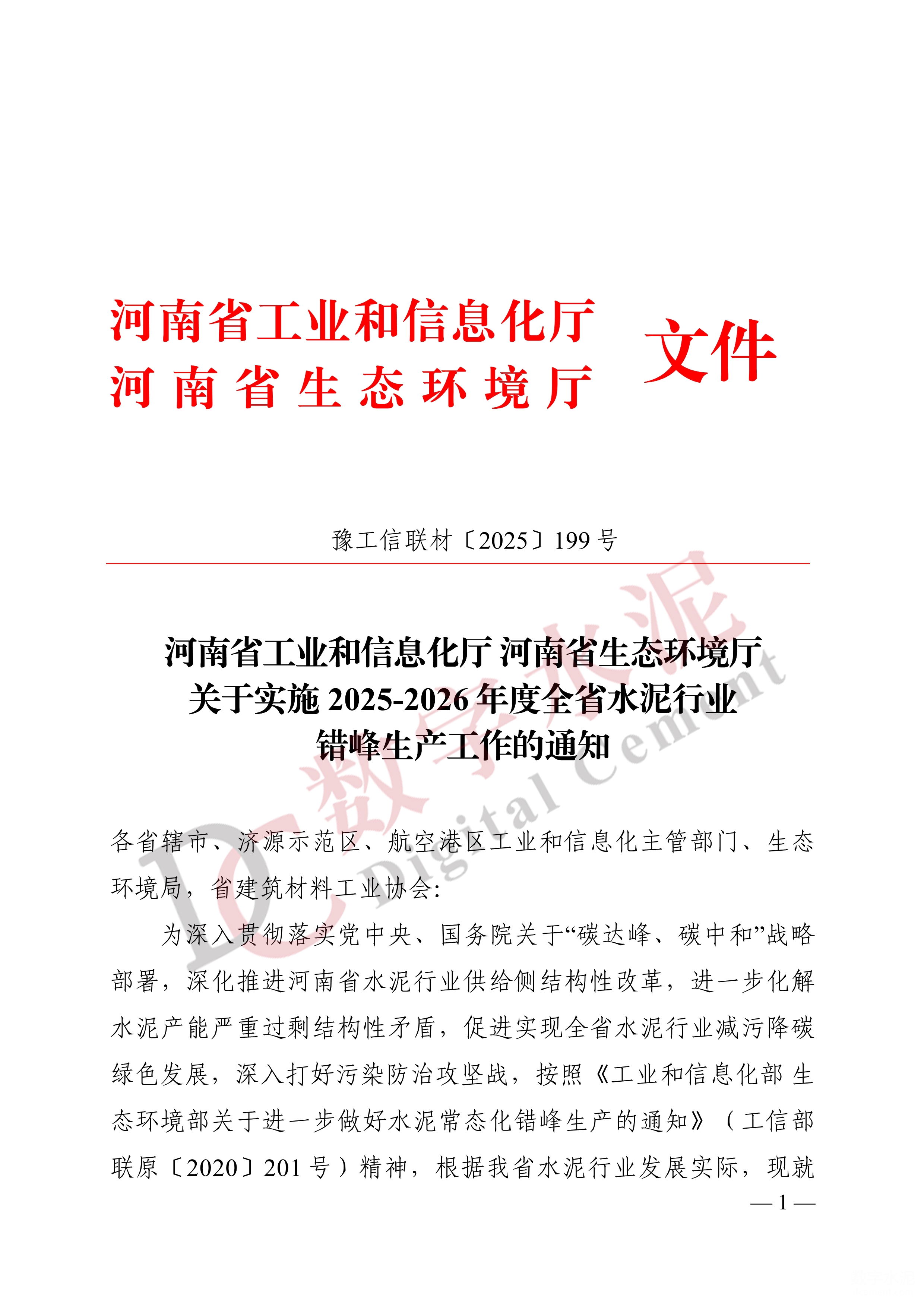 摘要:河南省所有水泥熟料生产企业2025年11月15日至2026年3月15日实施错峰生产,共计121天。